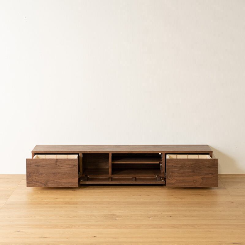 無垢材の前板の木目がつながり、素材の美しさが際立つ、重厚感のあるAVボード(TVボード)です。